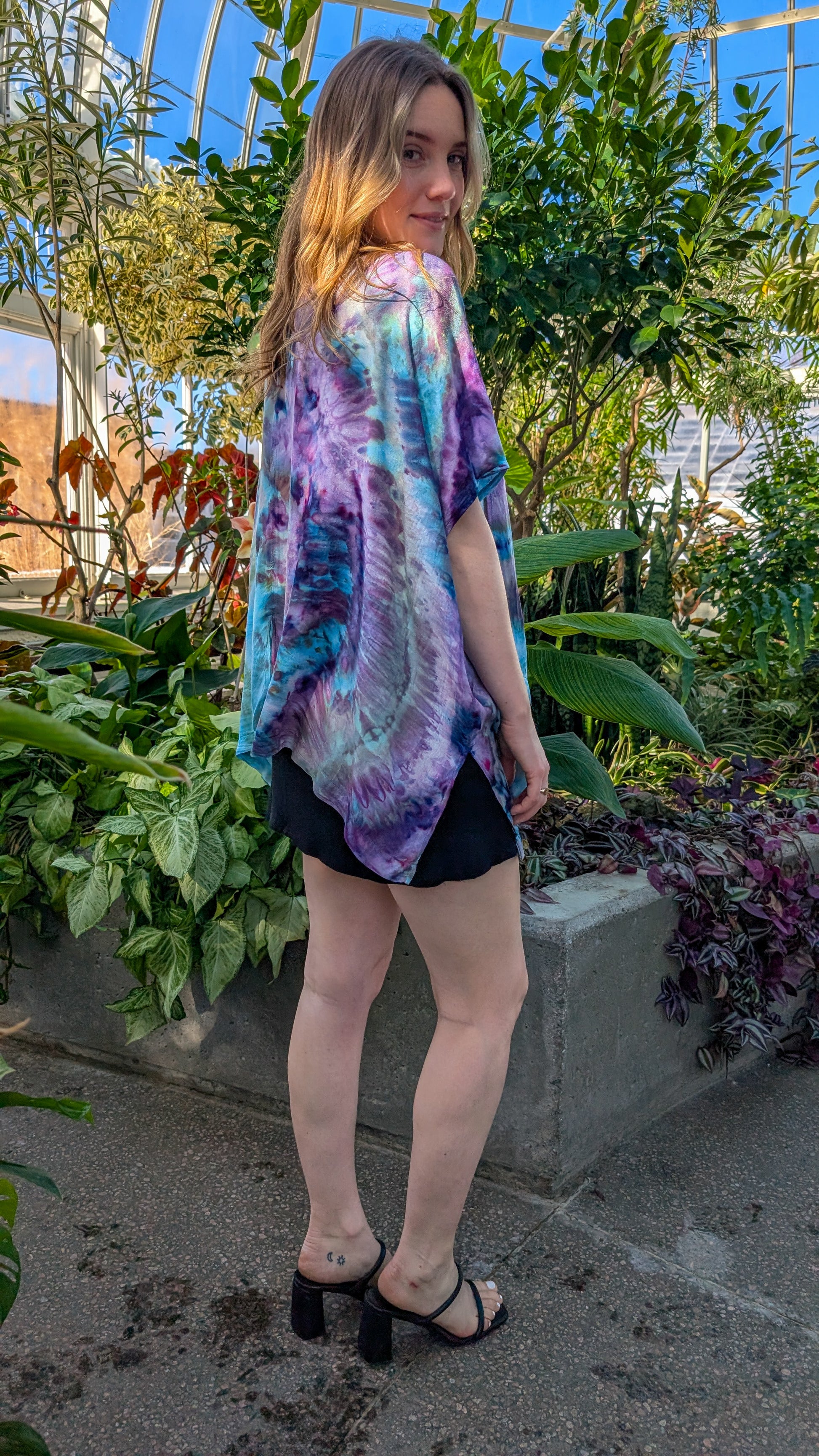 One size fits most. Measuring 35 inches wide by 27 inches from shoulder to hem (flat), with 10-inch slits along side seams and back seam.